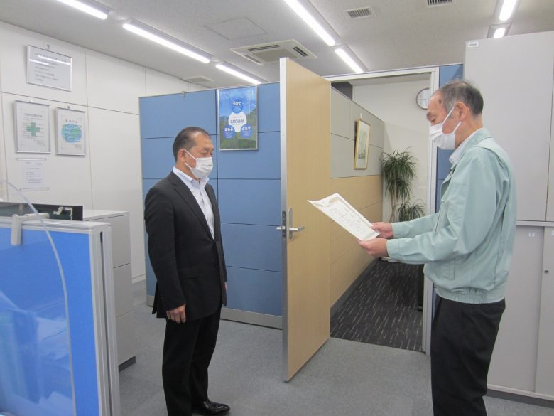 九州電力送配電株式会社より表彰状授与 福岡支店 2022年07月12日 九州電力送配電株式会社 延岡送変電工事所 小笠原所長より、福岡支店 國武賢輔副長に対し、日向幹線新設工事の用地業務復旧交渉において、残地目標の達成ならびにコスト削減に多大な貢献をしたことに対し表彰状が授与されました。