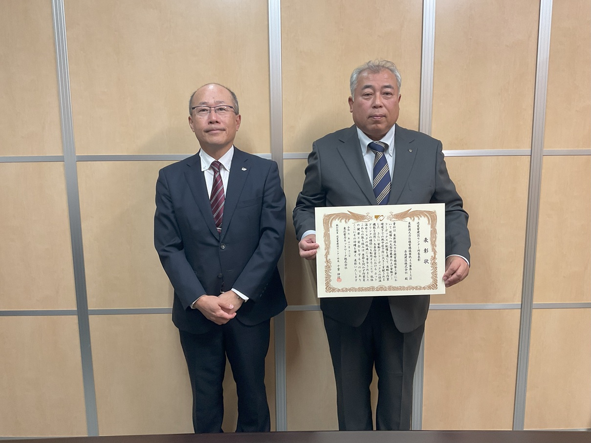 東北電力ネットワーク株式会社より表彰状の授与 仙台支店 2025年11月12日 このたび、東北電力ネットワーク株式会社 送変電建設センター 千葉伸行所長より、「東新潟火力B線電線張替他(その4)工事」(第1工区)において、現場への大型冷蔵庫および電動クーラーボックスの配備を通じ、過酷な作業環境下での熱中症予防に大きく貢献し、作業員の健康と安全の確保に寄与したことが高く評価され、表彰状が授与されました。