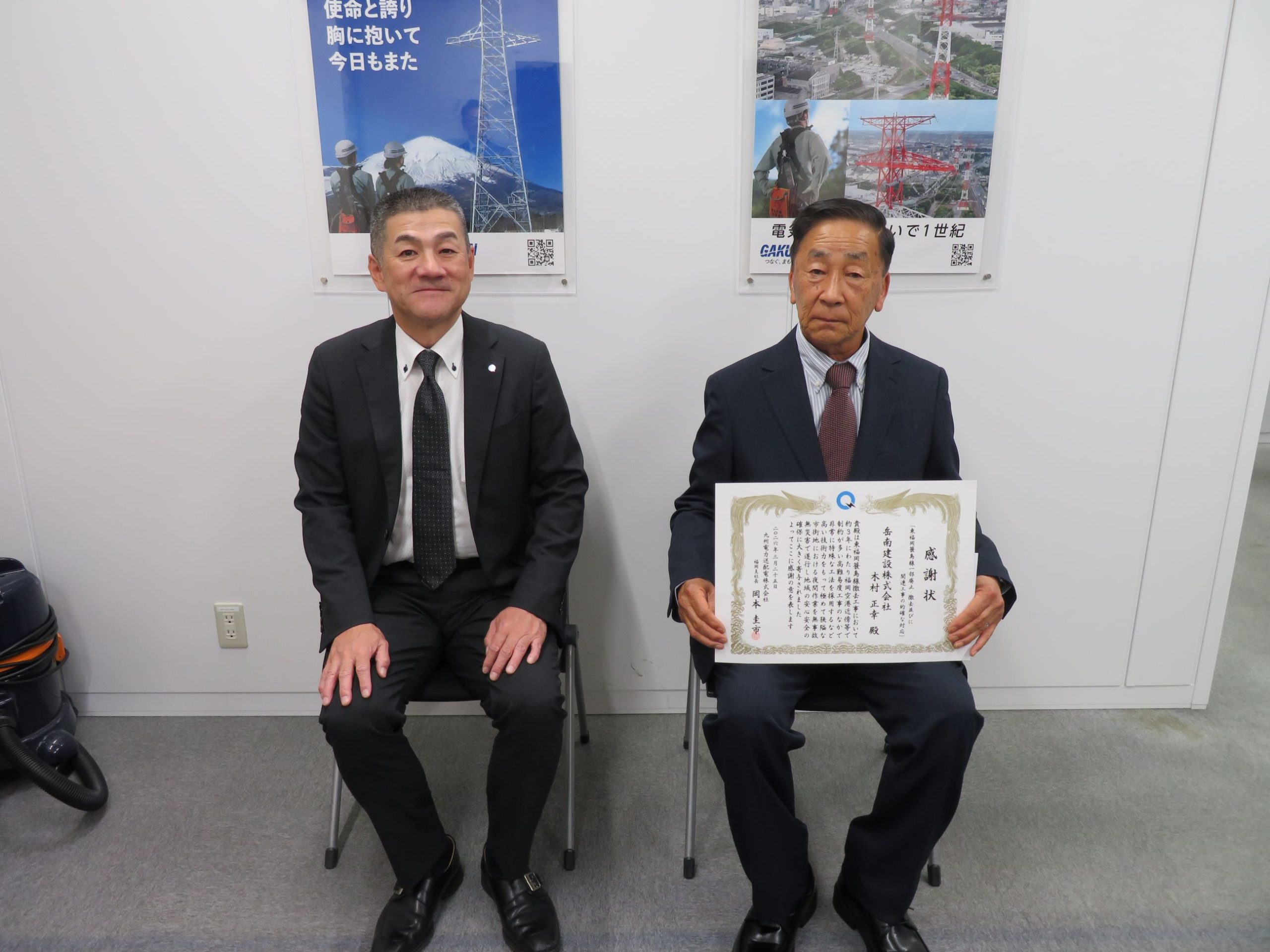 九州電力送配電株式会社より感謝状の授与 福岡支店 2026年03月26日 九州電力送配電株式会社 岡本福岡支社長より、東福岡簑島線一部廃止・撤去並びに関連工事において、福岡空港の近傍の制約が多い環境下において、特殊工法の採用など高い技術力をもって無事に竣工したことに対し、感謝状が授与されました。
