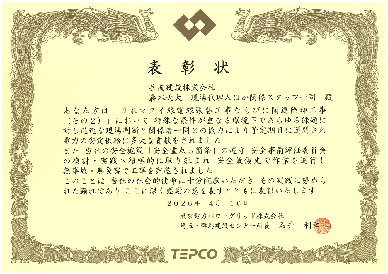東京電力パワーグリッド株式会社より表彰状の授与 本社 2026年04月17日 東京電力パワーグリッド株式会社 埼玉・群馬建設センター 石井所長より、日本マタイ線電線張替工事ならびに関連除却工事(その2)において、東京電力パワーグリッドの「安全重点5箇条」の遵守、また安全事前評価委員会の検討・実践へ積極的に取り組み、安全最優先で作業を遂行し、無事故・無災害で工事を完遂したことに対し、表彰状が授与されました。